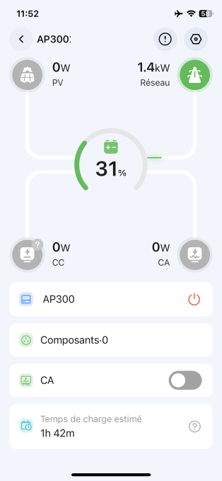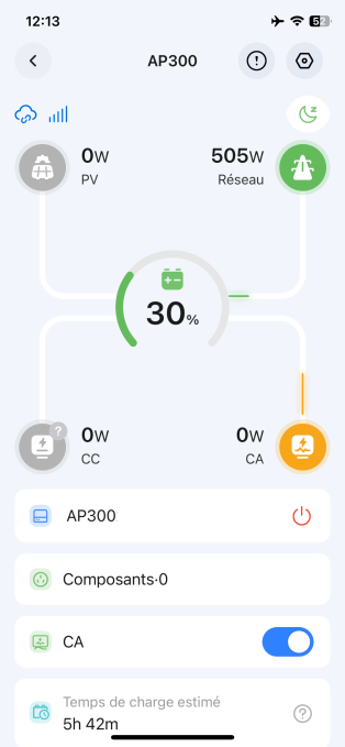 En pratique, l’application est fonctionnelle mais légèrement moins fluide que celles d’EcoFlow ou d’Anker. La connexion Bluetooth est parfois capricieuse lors du premier appairage. Ce n’est pas rédhibitoire, mais dans cette catégorie de prix, on pourrait attendre une expérience un peu plus polie. L’écran de l’Apex 300, en revanche, est lisible et bien organisé : il affiche clairement la puissance d’entrée, de sortie, l’état de charge et la durée restante estimée. Tous les boutons et connecteurs sont clairement étiquetés, ce qui autorise une prise en main rapide même pour un utilisateur peu expérimenté.